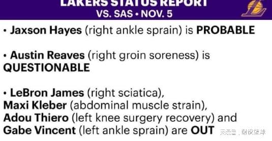 顯然這樣一場卡位戰(zhàn),無論對(duì)于湖人還是馬刺,都算迎來關(guān)鍵對(duì)決。只不過湖人兩名主要輪換,都處于出戰(zhàn)成疑狀態(tài),奧斯汀-里夫斯因?yàn)楦构蓽纤嵬?,進(jìn)入了傷病名單,此外中鋒賈克森-海斯,同樣存在右腳踝扭傷情況,只不過他依然會(huì)大概率出戰(zhàn)。